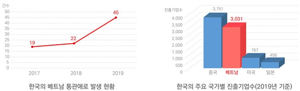 베트남은 우리나라와 교역규모로 4위, 우리 기업의 해외 진출기업수로 2위, 해외 투자순위에서 1위로 교역비중이 크게 늘어나 관세 및 통관애로 또한 증가하는 추세다.