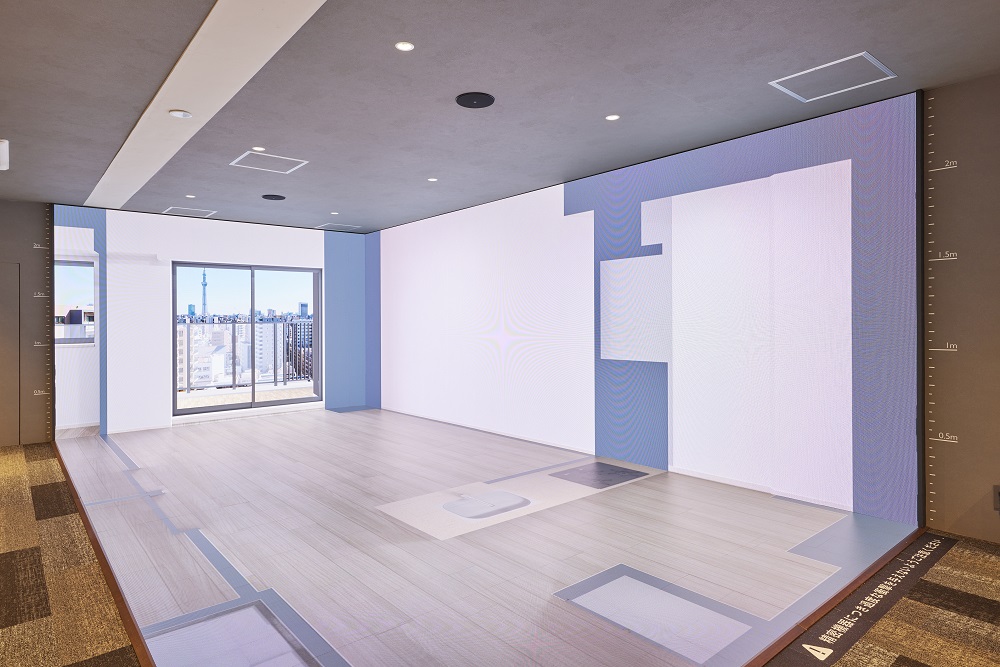 シアター空間は床1面、壁2面のLEDパネルで構成し、端末操作により他の間取りの表示に切り替えられる。間取りの形状や広さ、高さをシアター内で体感できるため、実際の部屋にいるかのように感じられる。従来、モデルルーム以外の間取りは2次元の図面から想像するしかなかった。