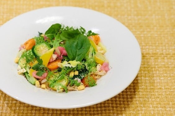 黄色を基調とし、春野菜をふんだんに盛り込んだ期間限定メニュー。玄米粉を使用した自家製の生パスタなど、美も健康も叶える「グルテンフリー」のパスタプレートセットです。