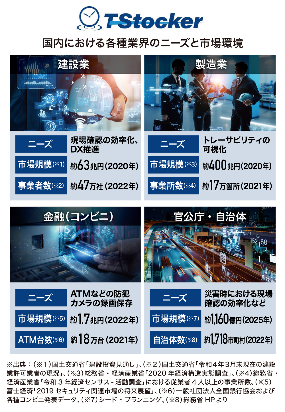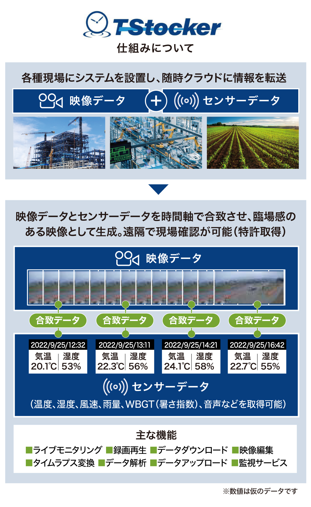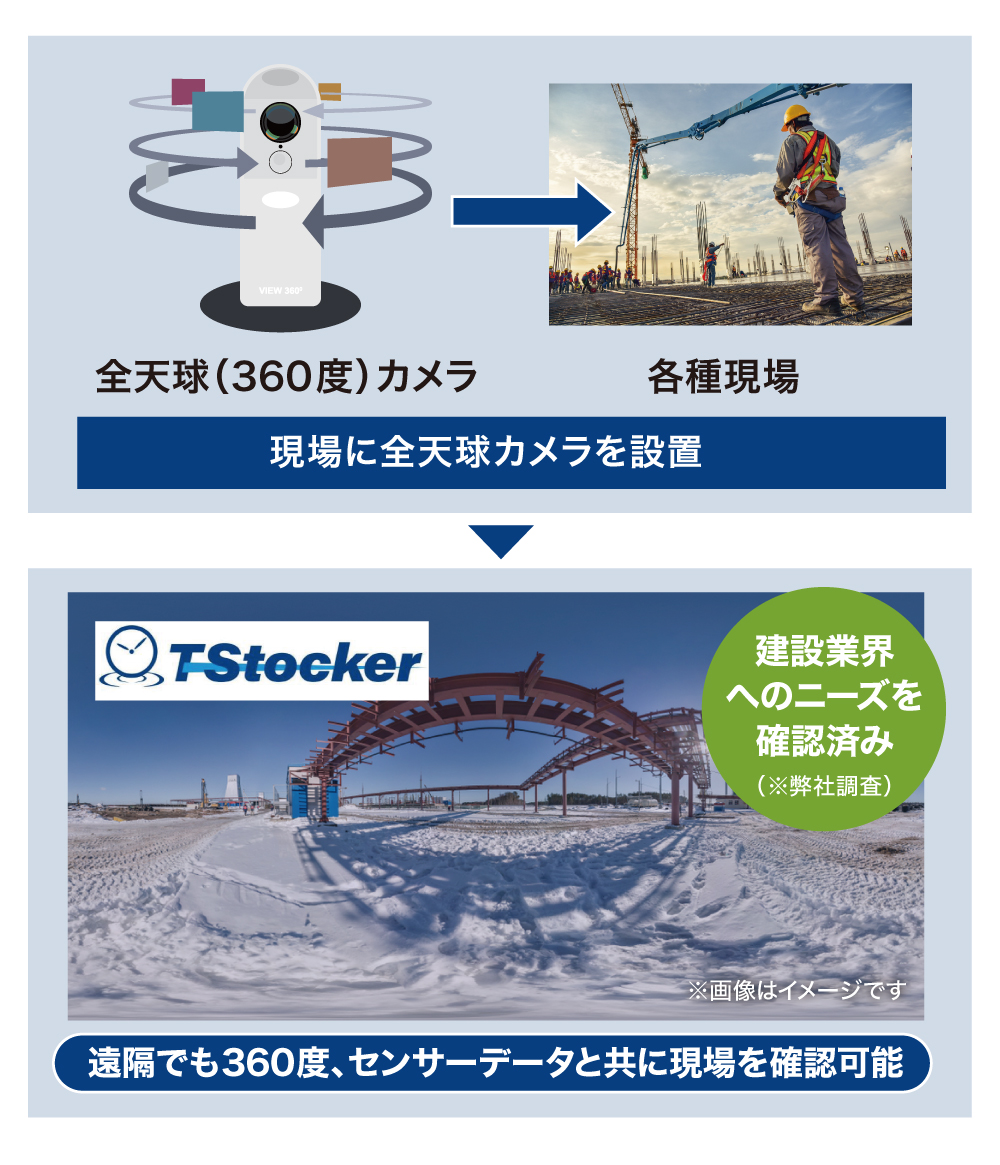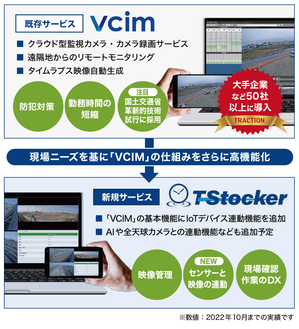 スリーフィールズ株式会社は、クラウドソリューション事業の中で展開していた「VCIM(ブイシム)」の仕組みをさらにアップデートし、温度や湿度などの各種センサー情報を映像と融合可能な「TStocker(ティーストッカー)」を開発しました。「TStocker」の前身である「VCIM」は、平成30年度国土交通省革新的技術対象技術I項目12番の試行に採用された技術です。西武建設株式会社や前田建設工業株式会社をはじめ、地方のゼネコンなど50社以上に導入されています。「TStocker」は、すでに西武建設株式会社でテスト導入が始まっており、本ツールに関連する2つの技術の特許も取得しており、今後は官公庁、自治体、金融業や流通・小売業、その他業種での展開も想定でき、さらにはエンターテインメント領域や個人での活用なども想定しています。