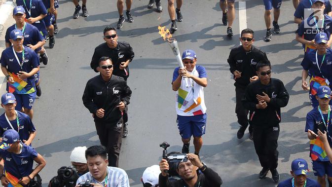 Api obor Asian Games 2018 dalam Torch Relay Asian Games 2018 di kawasan TMII, Jakarta Timur, Rabu (15/8). Pada Jumat (17/8), kirab obor berlanjut di wilayah Kab Administrasi Kepulauan Seribu, lalu ke Monas dan Istana. (Liputan6.com/Immanuel Antonius)