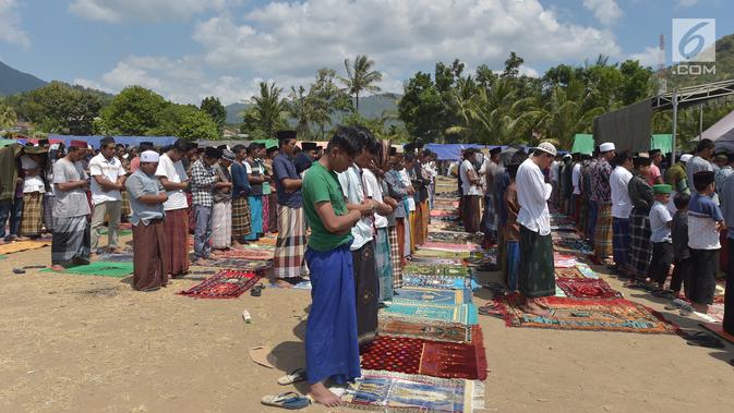 Umat muslim salat Jumat di sebuah ladang di dekat tempat penampungan sementara setelah gempa di Pemenang, Lombok (10/8). Menurut menteri senior, korban tewas akibat gempa dahsyat 6,9 SR di pulau Lombok melonjak di atas 300 orang. (AFP Photo/Adek Berry)