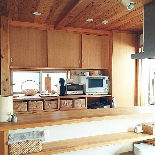 こちらのユーザーさんは、キッチンの収納に無印良品のラタンバスケットを使用しています。木のぬくもりを感じるシンプルナチュラルなインテリアに、ラタンがニュアンスのある表情をプラスしていますね。