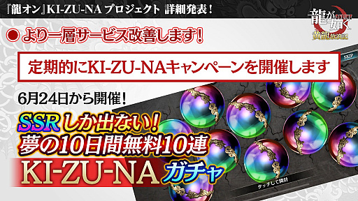 ユーザーの声を聞き、ユーザーの期待に応え『龍オン』の更なる改善を目的として立ち上げられた「REBORN PROJECT」。その第二弾として発足した「KI-ZU-NAプロジェクト」の詳細を、生放送番組にて発表しました。
