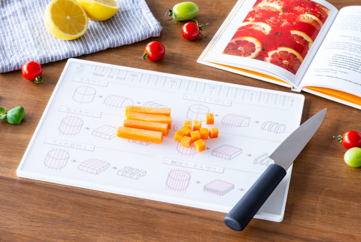 同商品は、食材をカットする際に使うまな板に、さまざまな切り方の見本を載せたもの。レシピに出てくる「○○切り」がわからず、調理中にスマホで検索したり、その度に手を洗うという面倒を省くことができる。