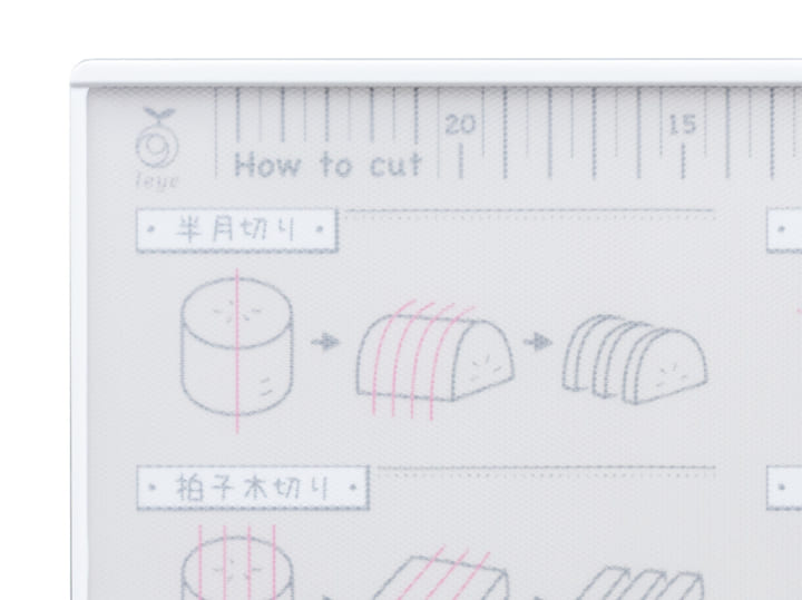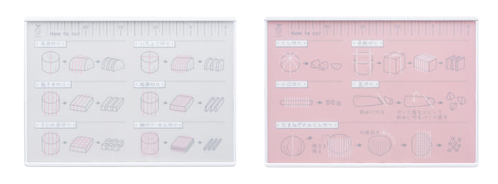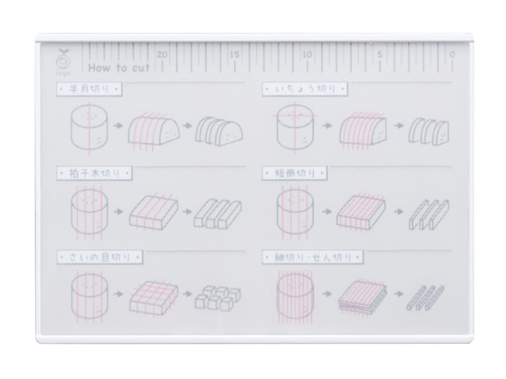 「短冊切り」「拍子木切り」など、少し迷う11種類の切り方を両面にわたり記載。カットの目安になる目盛りがついており、フチ部分は滑りにくいエラストマー製、本体は抗菌剤入りとなっている。