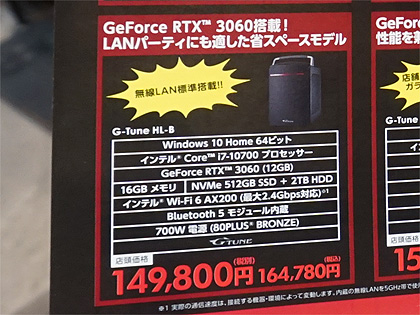 主なセール品を挙げると、Core i7-10700/GeForce RTX 3060搭載の小型デスクトップPC「G-Tune HL-B」が149,800円(税別)、Core i7-10870H/2,560×1,440ドット液晶(165Hz対応)/GeForce RTX 3060 Laptop搭載の15.6型ノートPC「G-Tune E5-165」が174,800円(税別)、Celeron N4100/フルHD液晶搭載の14型ノートPC「mouse C4」が49,800円(税別)など。