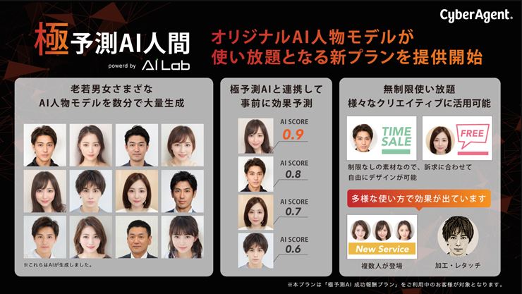 株式会社サイバーエージェントは6月24日、AI事業本部が提供する「極予測AI人間(キワミヨソクエーアイニンゲン)」において、老若男女さまざまなAI人物モデルが使い放題となる「極予測AI人間使い放題プラン」の提供を開始すると発表した。