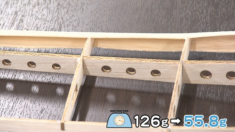 翼に使用する木材を薄いものに変えたり、パーツに穴を開けて軽くした結果、126グラムあった機体を2分の1の重さ(55.8グラム)に改良することができた。