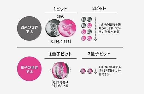 従来のコンピューターは、「0」か「1」の値をとる「ビット」を基本単位として計算する。これに対して量子コンピューターは、「0」と「1」どちらでもある「量子ビット」を基本単位として計算する。いうなれば、コインが表か裏のどちらかを示している状態と、回転し続けている状態の違いだ。