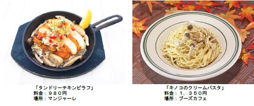 秋の味覚のひとつである、キノコをたっぷりと使用した「タンドリーチキンピラフ」や「キノコのクリームパスタ」、栗の控えめな甘さとソフトクリームがマッチした「モンブランサンデー」など、メインのお食事からスイーツまで取り揃えます。