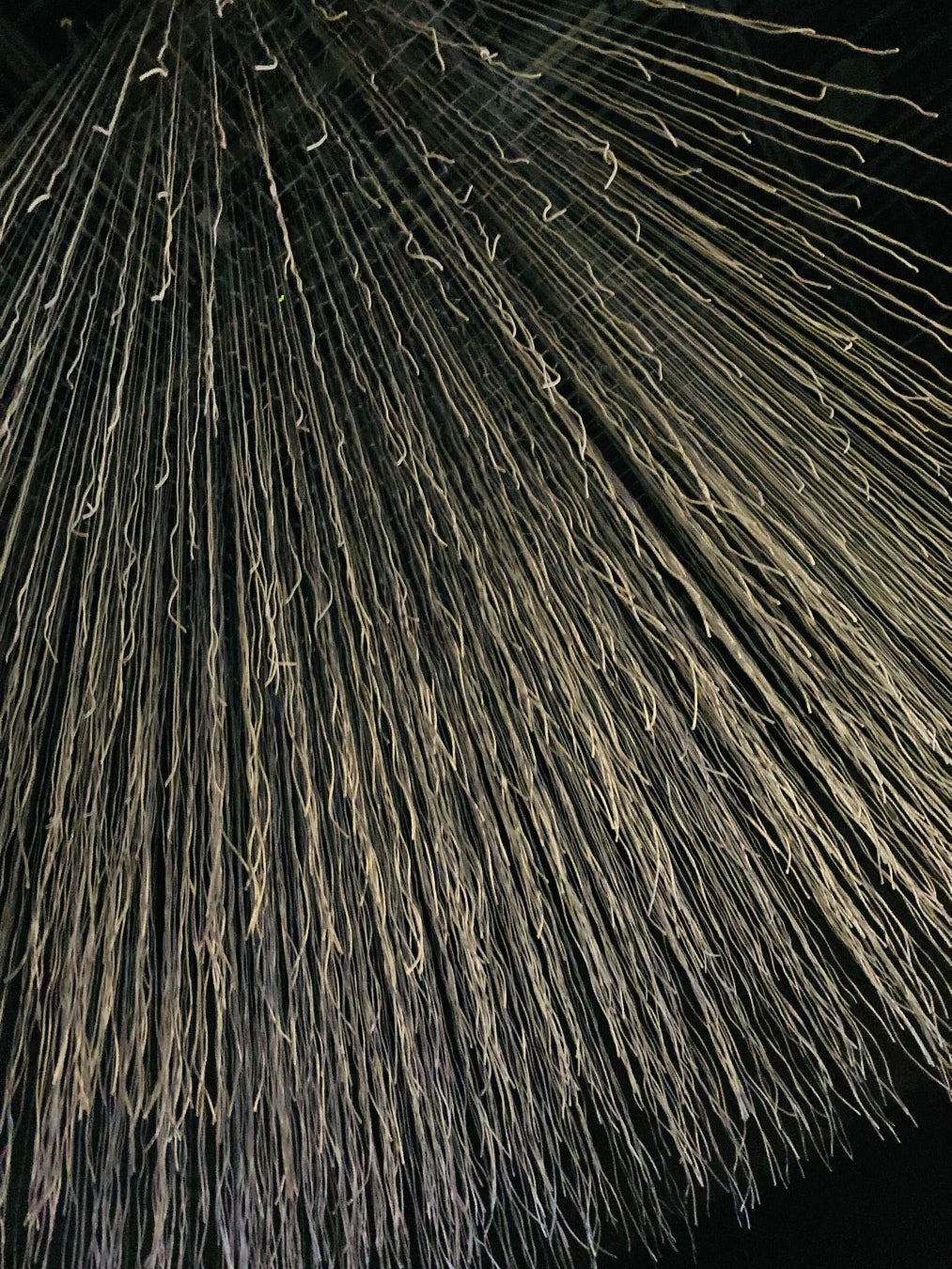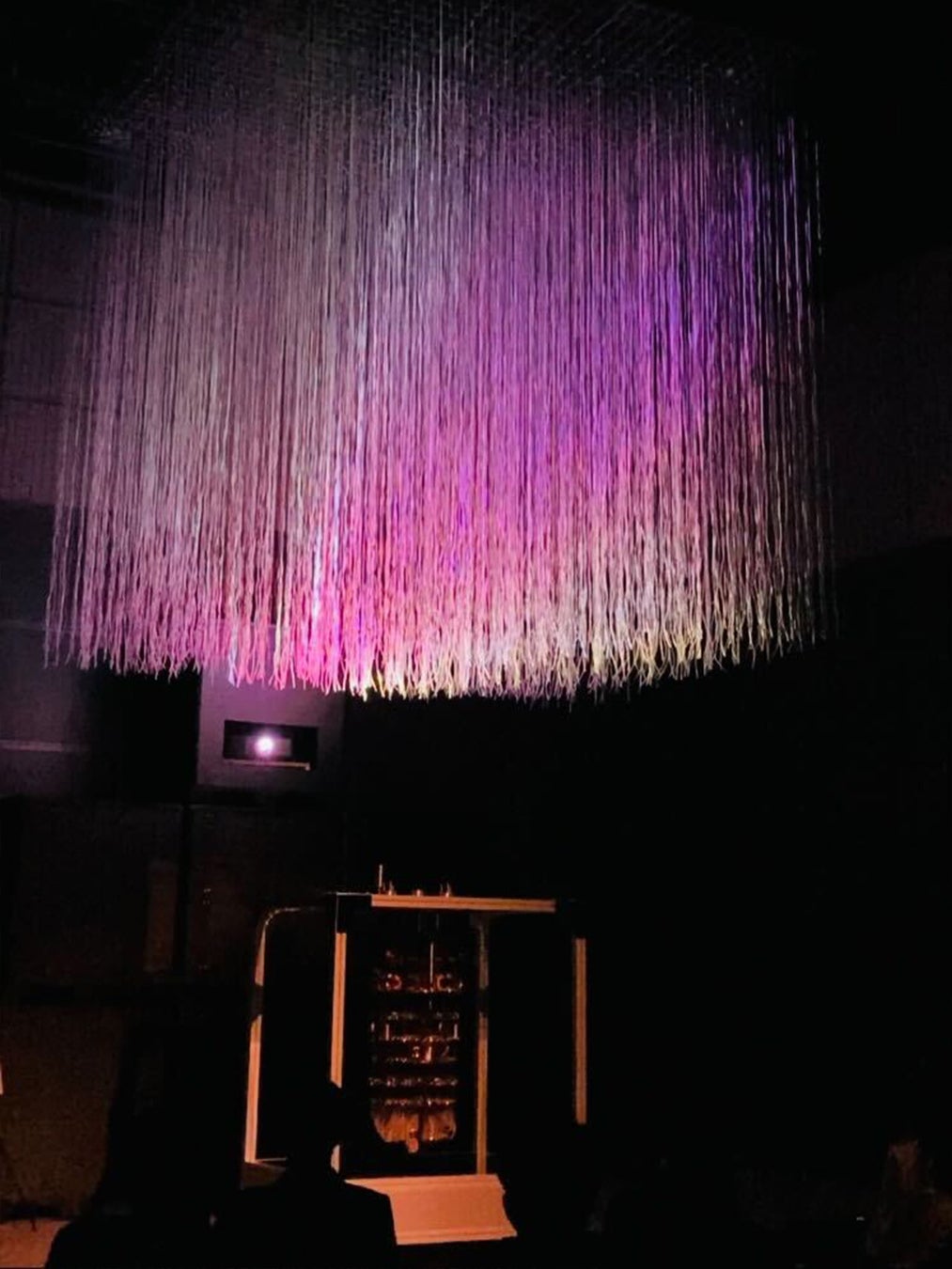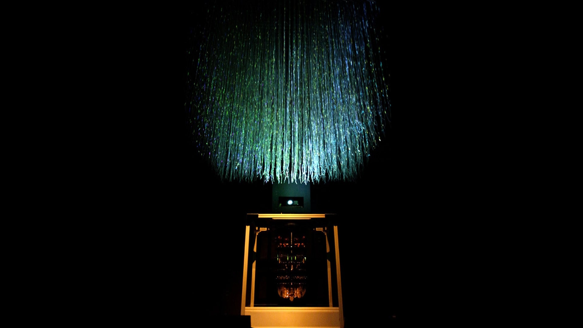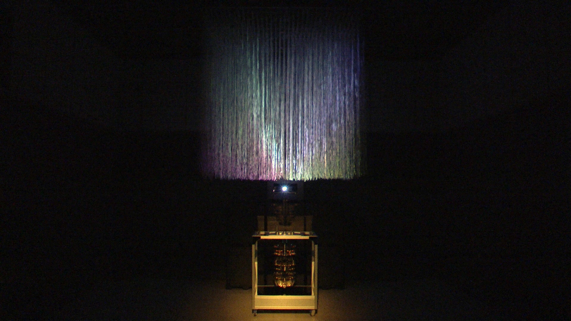 幅3.5メートル、奥行き3.5メートルのスペースに、長さ3.5メートルのペットボトル再生繊維約250本を天井から吊り下げてつくられた巨大な糸のボリュームを制作。この巨大なボリュームに綿密に計算・制御された幾筋もの光を投射することで真っ暗な会場の中空に立体的な光のアート作品を生み出します。
