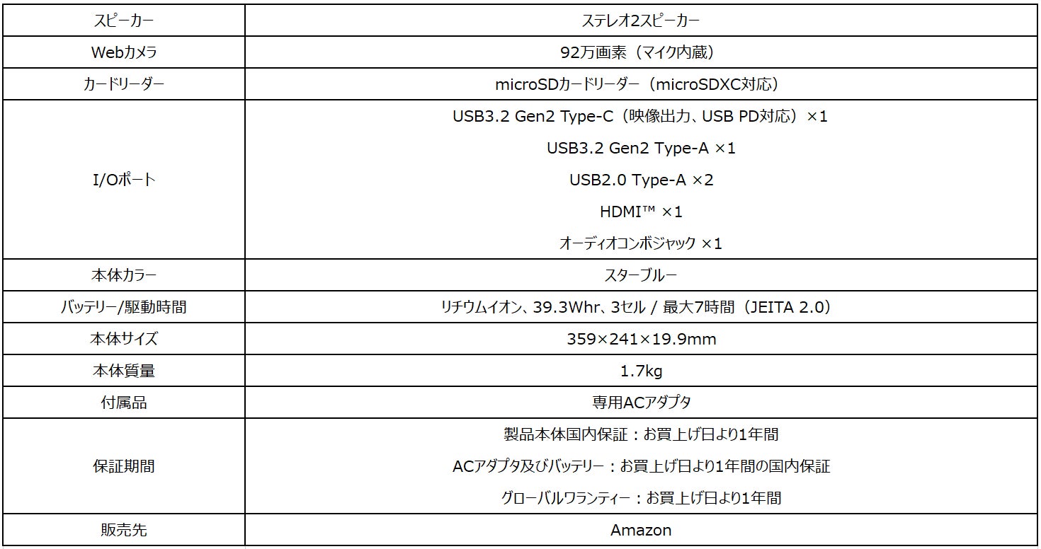 この他、無線LAN「Wi-Fi 6」やマイク内蔵Webカメラを標準搭載し、別途USBデバイスを接続する必要なくWi-Fiルーターへ接続してビデオチャットやビデオ会議に参加することができます。また、大画面のPCモニターやプロジェクタへ変換アダプタなしで映像出力できるHDMI™やUSB PowerDeliveryに対応したUSB3.2 Gen2 Type-Cなど各種拡張ポートも取り揃えております。