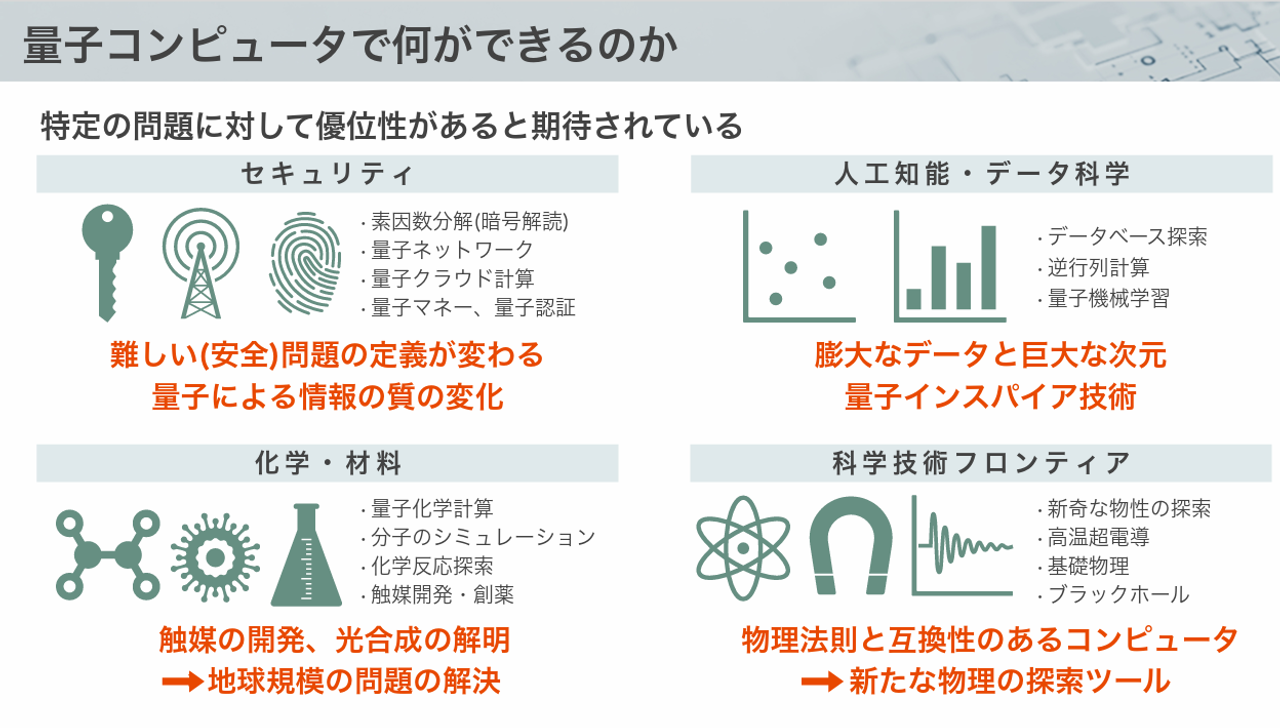 また最近では、ノイズをある程度許容した「NISQ」(Noisy Intermediate-Scale Quantum deviceの略)というタイプの量子コンピューターで使えるアルゴリズムを構築しようという動きも進んでいます。ここで実社会に活用できるものを生み出すことができれば、量子コンピューターの社会実装は、さらに加速するかもしれません。