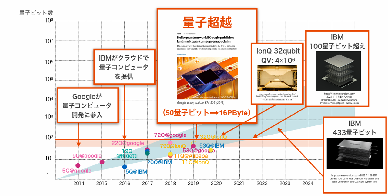 量子情報科学分野の老舗で基礎研究を続けてきた米IBMも、グーグル参入のタイミングから人員を増やして研究開発に乗り出しています。2016年には5量子ビットの量子コンピューターをクラウドで公開。2022年には433量子ビットを搭載したプロセッサも発表しました。