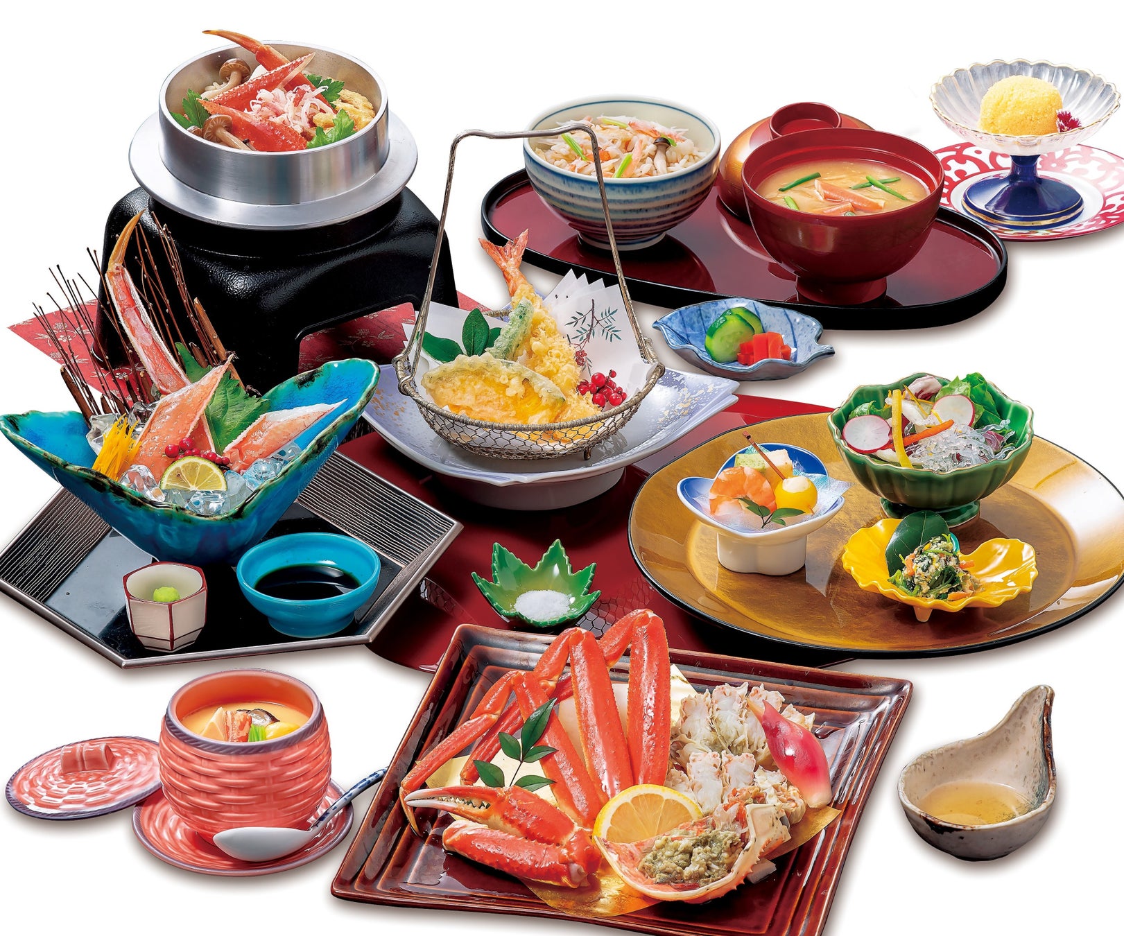 内容: ずわい半身盛り・かに釜めし・小鉢2種・かに刺身・かに茶碗蒸し・海老天ぷら・香の物・お椀・サラダ・デザート