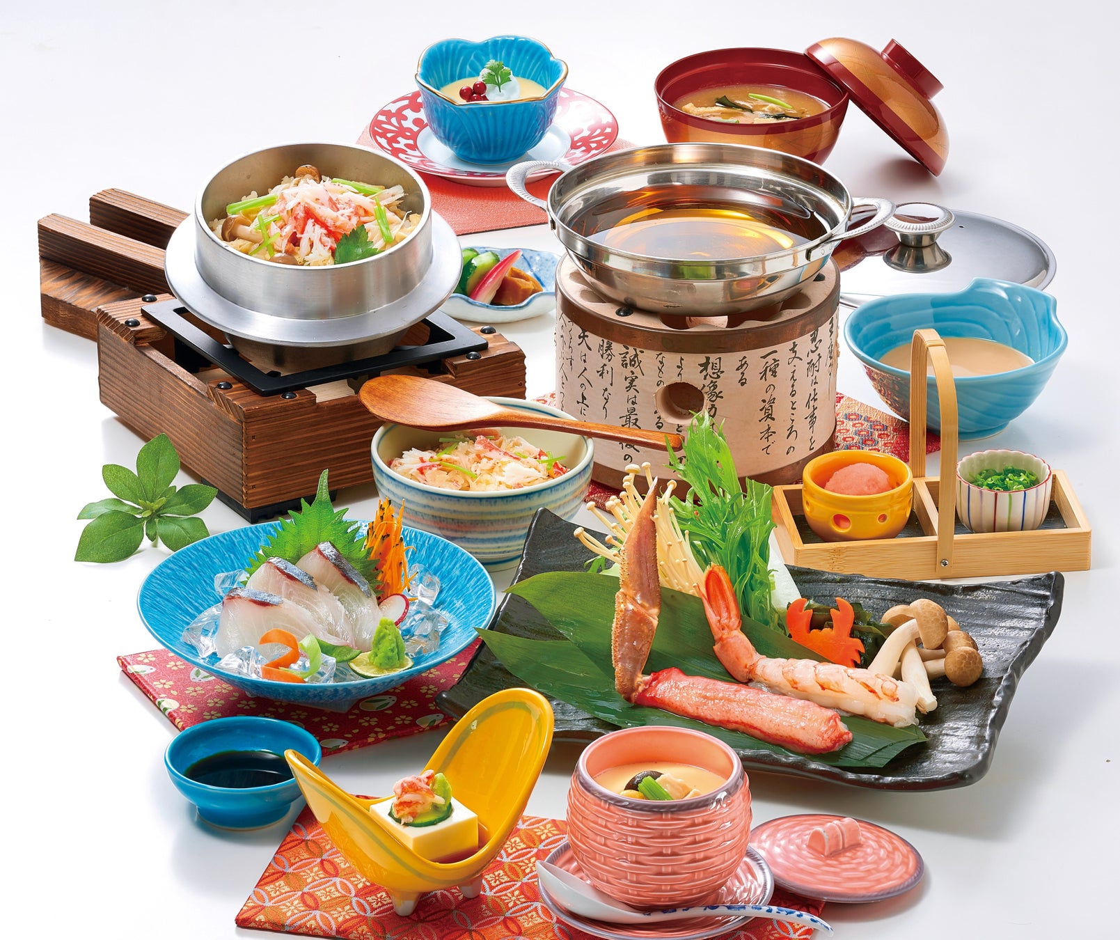 かに味噌付きの茹でずわいの半身盛りやたっぷりのかに身が入った名物「かに釜めし」なども楽しめる