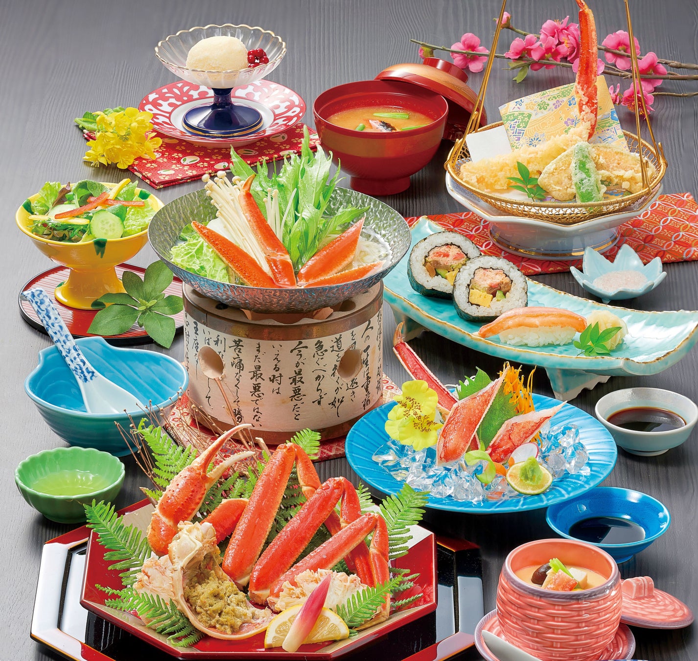 内容:ずわい半身盛り・かにすき小鍋・かに刺身・かに茶碗蒸し・かに天ぷら・寿司・お椀・サラダ・デザート